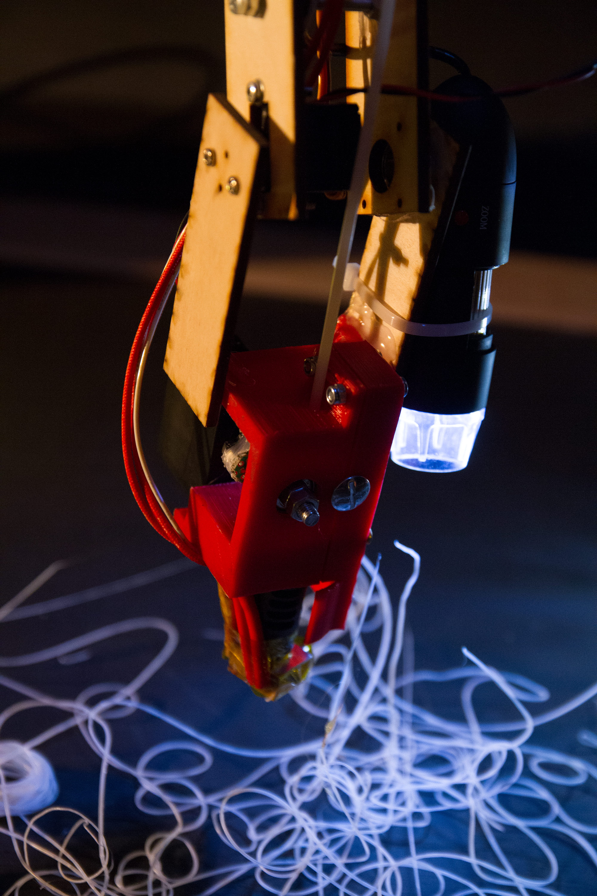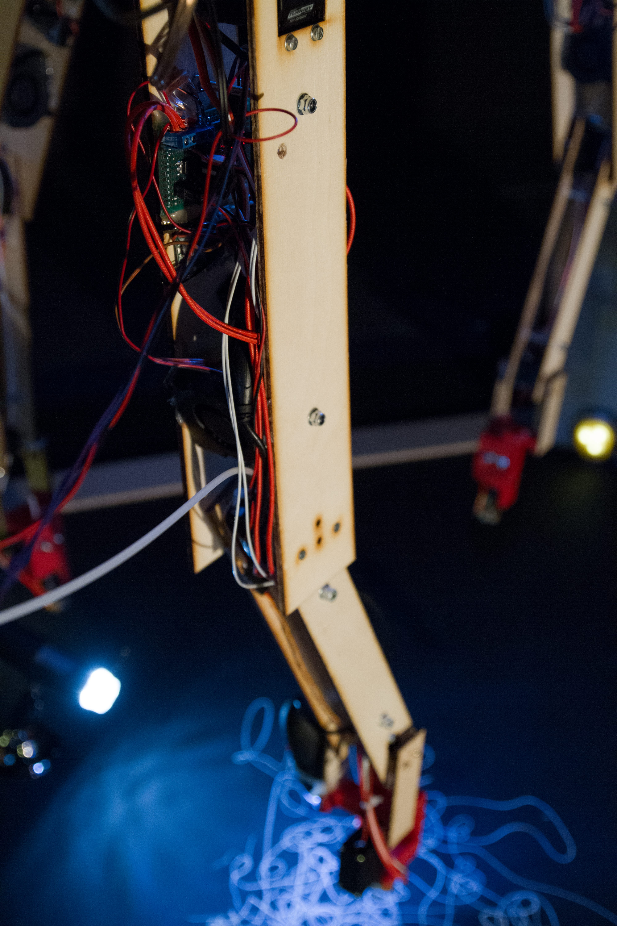 Ramiona robotów, czujnik warunków atmosferycznych i odległości, układ elektroniczne sterujace serwomechanizmami, filament, technologia druku 3D, wideo real-time (streaming), drewno, aluminium, pleksi (2014)
