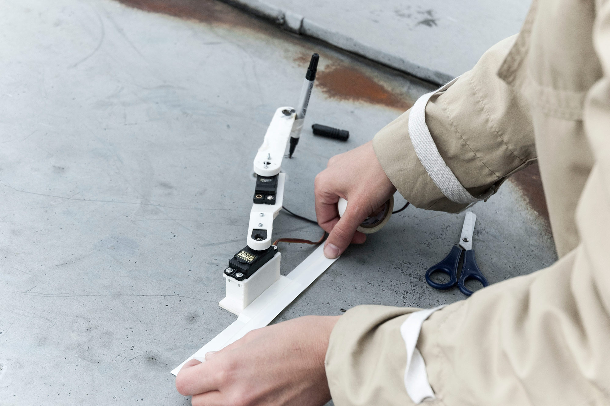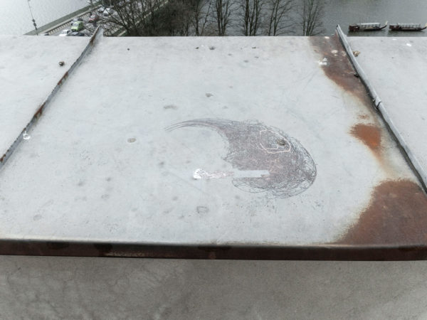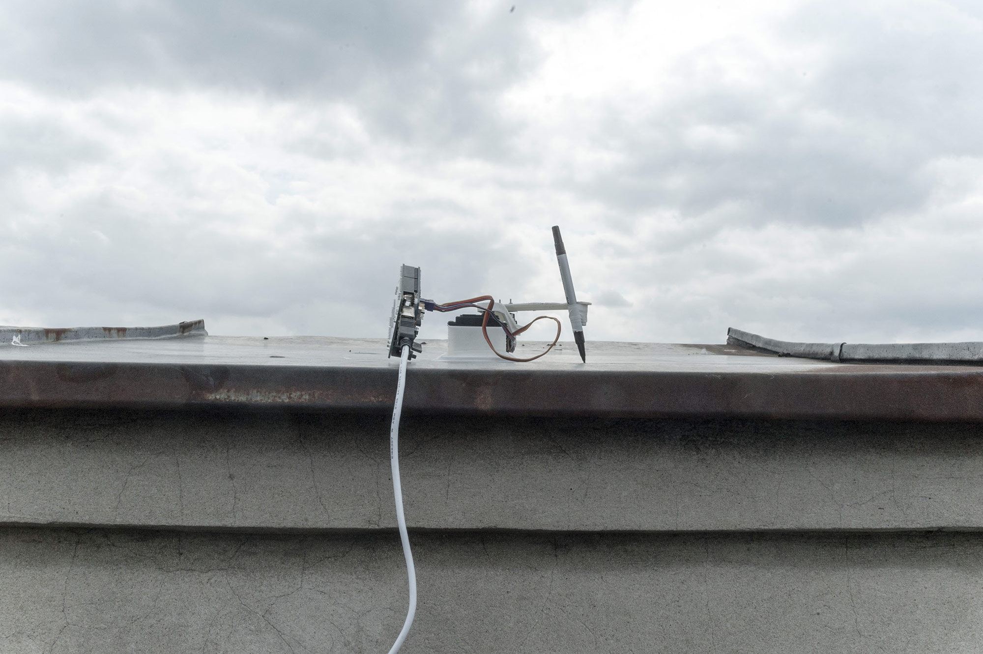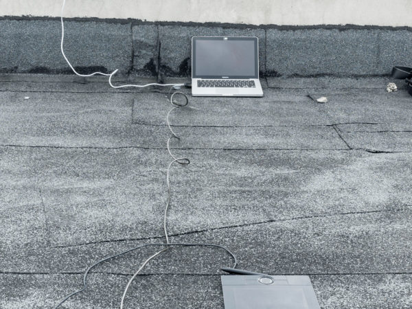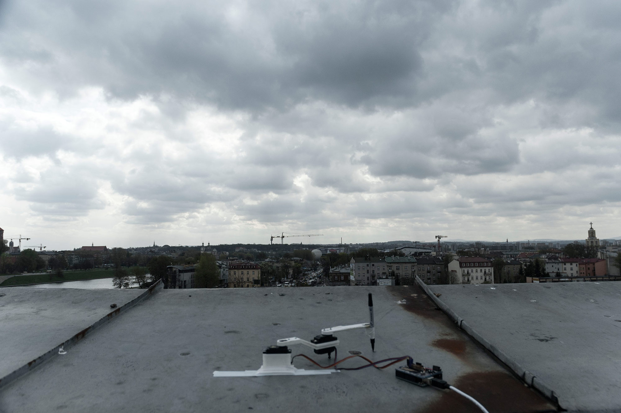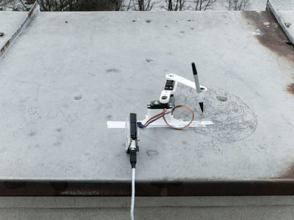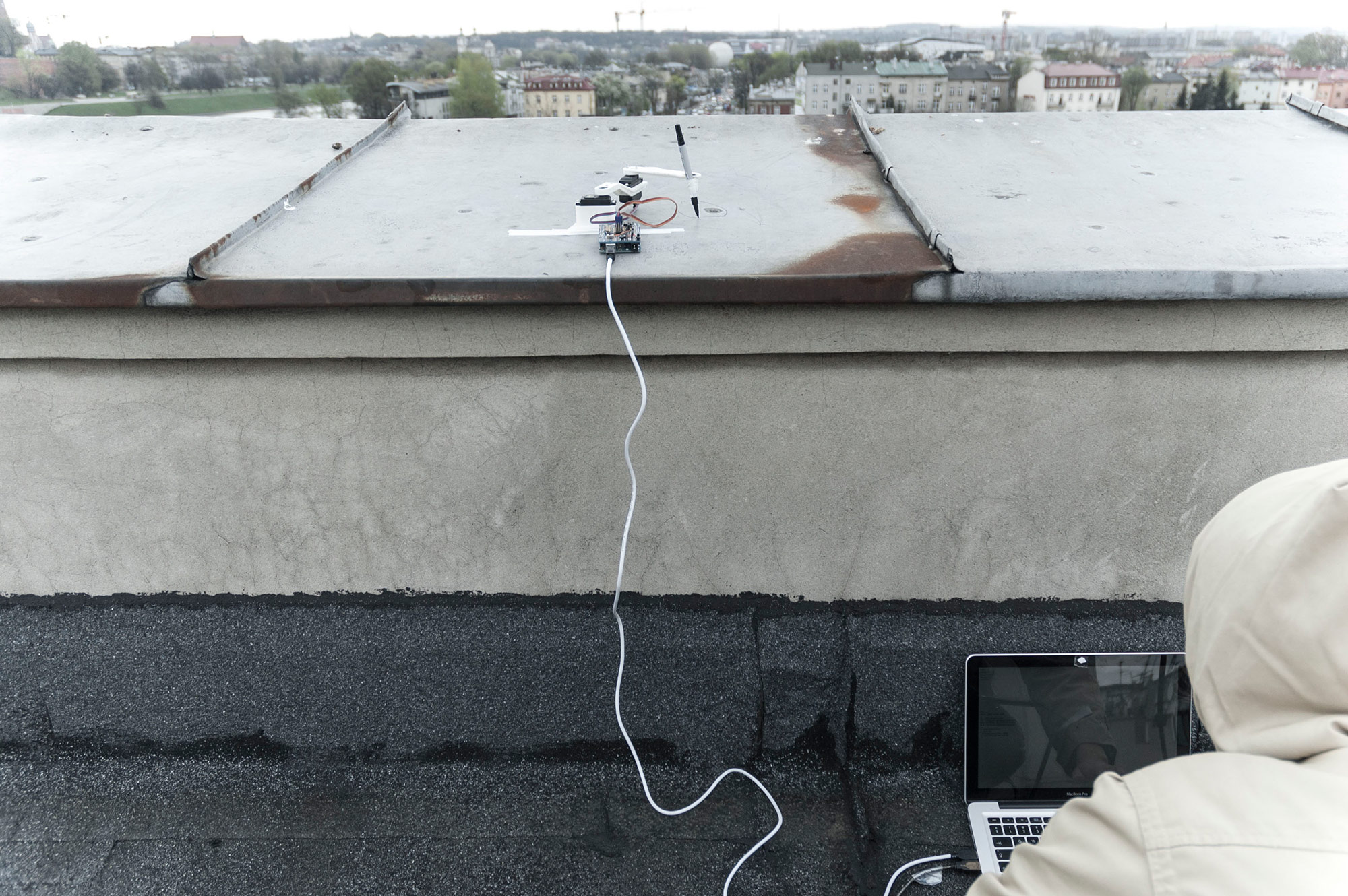 Instalacja Roof I (2014) została wykonana w ramach interwencji w przestrzeni publicznej podczas trwania międzynarodowych warsztatów Correspondences & Intervention przeprowadzonych w Krakowie w 2014 roku. (GROUP)ONE w ramach której współpracowałam, skoncentrowała się na interesującym aspekcie miasta, które traktuje jako nieuporządkowany zbiór wydarzeń w czasie i miejscu. Dualność przestrzeni, jej aspekt historyczny kiedyś i teraz, miejsce wewnątrz miejsca, jak i aspekt zachowywania informacji w różnych miejscach i jej transportowanie, przemieszczanie się. Grupa zwróciła uwagę na ciekawe zjawisko tworzenia się pustych przestrzeni wewnątrz masy, pośród tłumu, przestrzeni pustych i otwartych ale w domyśle gotowych do wykorzystania jako przestrzenie ekspozycjne. Skoncentrowała się na pracy z takimi pojęciami jak: pustka, przekraczanie granic struktury, chaos, dźwięki przemieszczającego się miasta oraz dźwięki przyszłości. Określić to można ogólnie jako poszukiwanie wolnej przestrzeni oraz pragnienie wolnej przestrzeni ekspozycyjnej. Instalacja Roof I zbudowana jest z robotycznego ramienia wyposażonego w pisak, które porusza się po metalowej powierzchni dachu. Jego ruchy sterowane są przy użyciu tabletu graficznego. W wyniku procesu rysowania powstaje trwały znak, zaszyty w tkance miasta. Bez podpisu autora.