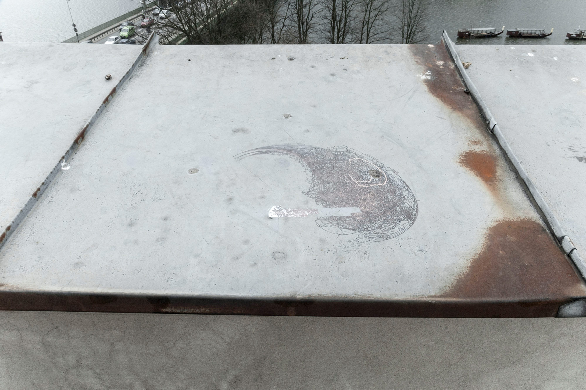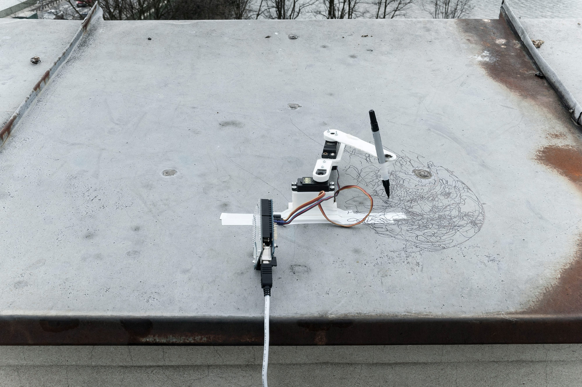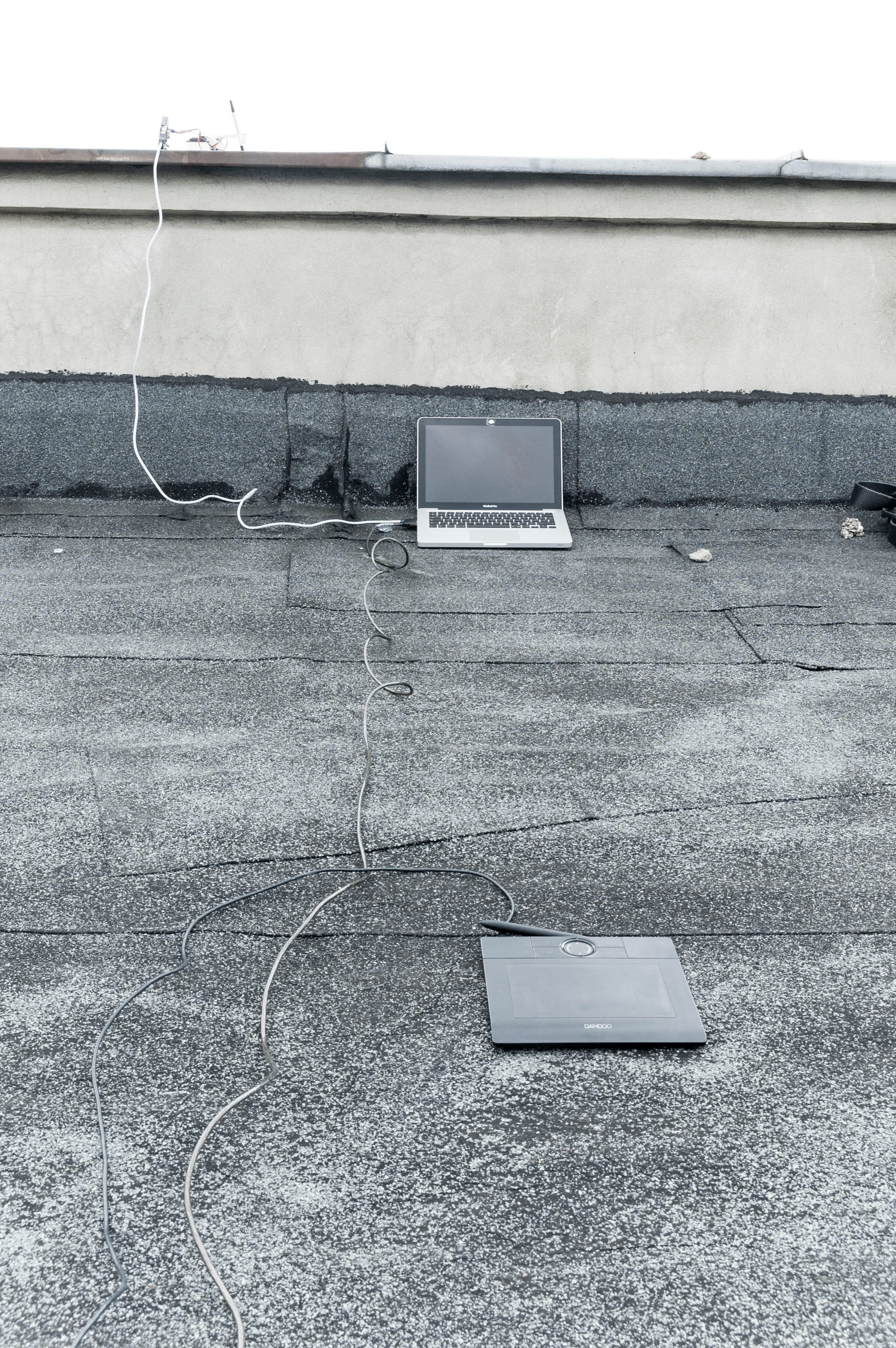 Instalacja Roof I (2014) została wykonana w ramach interwencji w przestrzeni publicznej podczas trwania międzynarodowych warsztatów Correspondences & Intervention przeprowadzonych w Krakowie w 2014 roku. (GROUP)ONE w ramach której współpracowałam, skoncentrowała się na interesującym aspekcie miasta, które traktuje jako nieuporządkowany zbiór wydarzeń w czasie i miejscu. Dualność przestrzeni, jej aspekt historyczny kiedyś i teraz, miejsce wewnątrz miejsca, jak i aspekt zachowywania informacji w różnych miejscach i jej transportowanie, przemieszczanie się. Grupa zwróciła uwagę na ciekawe zjawisko tworzenia się pustych przestrzeni wewnątrz masy, pośród tłumu, przestrzeni pustych i otwartych ale w domyśle gotowych do wykorzystania jako przestrzenie ekspozycjne. Skoncentrowała się na pracy z takimi pojęciami jak: pustka, przekraczanie granic struktury, chaos, dźwięki przemieszczającego się miasta oraz dźwięki przyszłości. Określić to można ogólnie jako poszukiwanie wolnej przestrzeni oraz pragnienie wolnej przestrzeni ekspozycyjnej. Instalacja Roof I zbudowana jest z robotycznego ramienia wyposażonego w pisak, które porusza się po metalowej powierzchni dachu. Jego ruchy sterowane są przy użyciu tabletu graficznego. W wyniku procesu rysowania powstaje trwały znak, zaszyty w tkance miasta. Bez podpisu autora.